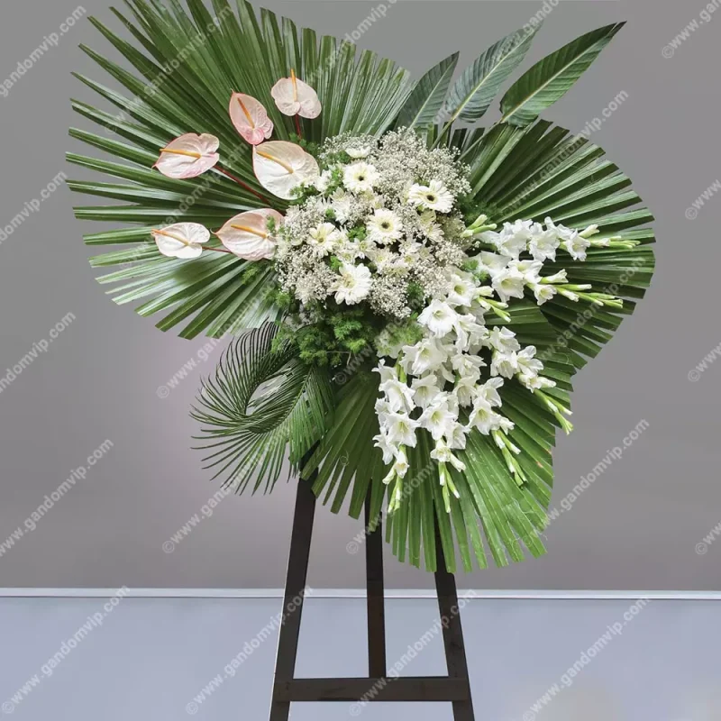 این تاج گل ترحیم با انتخاب دقیق رنگ و ترکیب گلها طراحی شده تا پیام همدردی، احترام و آرامشی لطیف را منتقل کند. هماهنگی میان گلایلهای سفید، ژربراهای ملایم و آنتوریومهای درخشان، جلوهای باشکوه و متین به مراسم میبخشد و کرزنتیا با برگها و خشکبار زینتی، حس طبیعی و متوازن را ایجاد میکند. جزئیات طراحی در زیر آمده است: