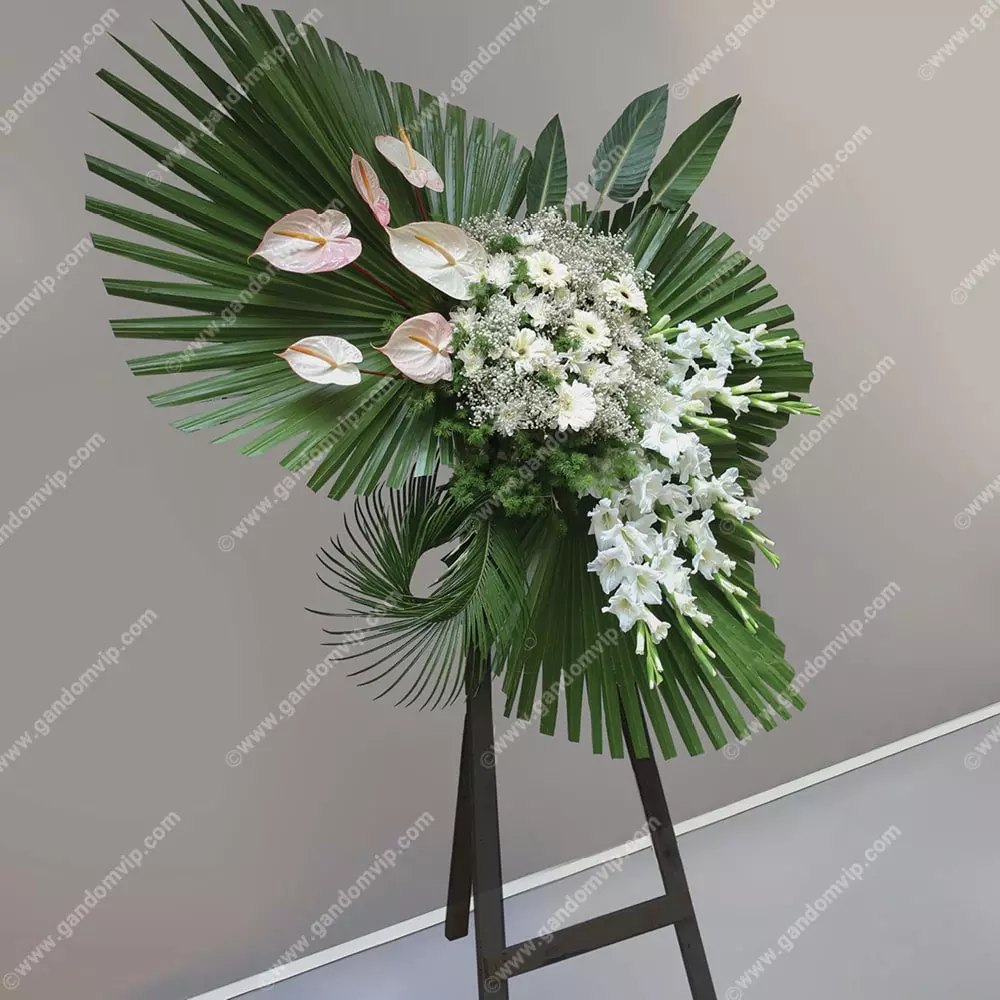 این تاج گل ترحیم با انتخاب دقیق رنگ و ترکیب گلها طراحی شده تا پیام همدردی، احترام و آرامشی لطیف را منتقل کند. هماهنگی میان گلایلهای سفید، ژربراهای ملایم و آنتوریومهای درخشان، جلوهای باشکوه و متین به مراسم میبخشد و کرزنتیا با برگها و خشکبار زینتی، حس طبیعی و متوازن را ایجاد میکند. جزئیات طراحی در زیر آمده است:
