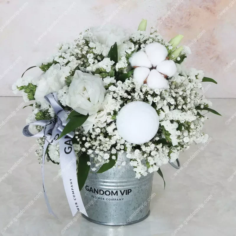 باکس گل با گلهای سفید زیبا و سطل با سادگی و جذابیت فوق العاده. مناسبترین انتخاب برای کسانی که دوستشان داریم. گلهای سفید بیانگر سادگی، پاکی و لطافت روح اند.